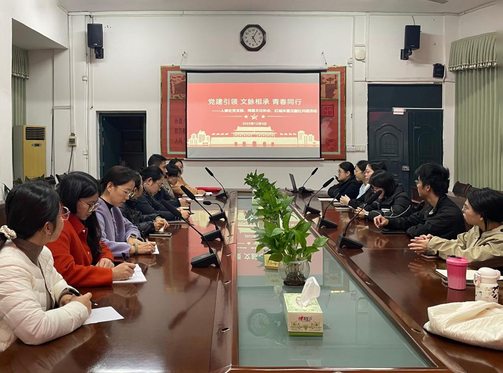 2025年12月3日下午,右江民族医学院人事处党支部与周易文化协会、红城半夏汉服社在图书馆二楼会议室联合举办党团共建主题党日活动。活动由人事处党支部组织委员韦菲菲主持,党支部书记黄冰主讲微党课,学生社团代表及支部党员共同参与,围绕传统文化、民族团结与党团互动展开深入交流。